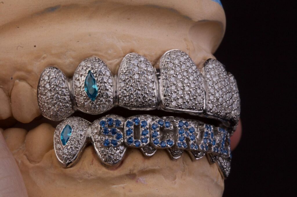Letícia absorve esse contexto cultural em seu trabalho. No Brasil, o grillz vem ganhando força dentro do rap, trap e funk, especialmente como parte do “estilo ostentação” que representa identificação com a periferia e com a ancestralidade preta. Para ela, não basta seguir a tendência: é preciso honrar a origem, garantir a função do dente e entregar uma peça com técnica odontológica, joalheria e significado social.
