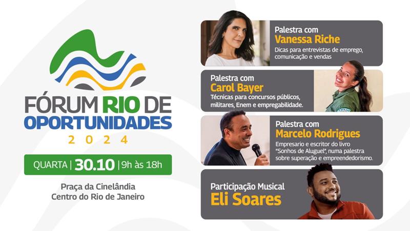 O Fórum Rio de Oportunidades ainda conta com shows do cantor gospel Eli Soares, bicampeão do Grammy Latino na categoria de Melhor Álbum de Música Cristã em Língua Portuguesa e intérprete dos hits “Me Ajude a Melhorar”, “Casa de Deus”, “Aonde Está Deus”, “Deus Não é Culpado”, “A Mesa”, “Se Eu Cair” e “Os Anjos Te Louvam”.